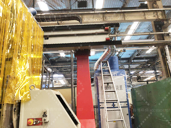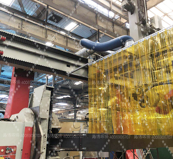 本項(xiàng)目用于山推焊接車間內(nèi)焊接機(jī)器人工位焊接煙塵治理,機(jī)器人工位工件尺寸較大,活動(dòng)范圍6M*5M,機(jī)器人在焊接過(guò)程中產(chǎn)生大量的煙塵。根據(jù)工況,路博環(huán)保采用移動(dòng)式頂吸罩對(duì)工位焊接煙塵進(jìn)行捕捉,在整個(gè)使用過(guò)程中不干涉機(jī)器人的動(dòng)作及工位的吊裝,每個(gè)工位配置一套除塵系統(tǒng),濾筒除塵器型號(hào)選用LB-CY-8.